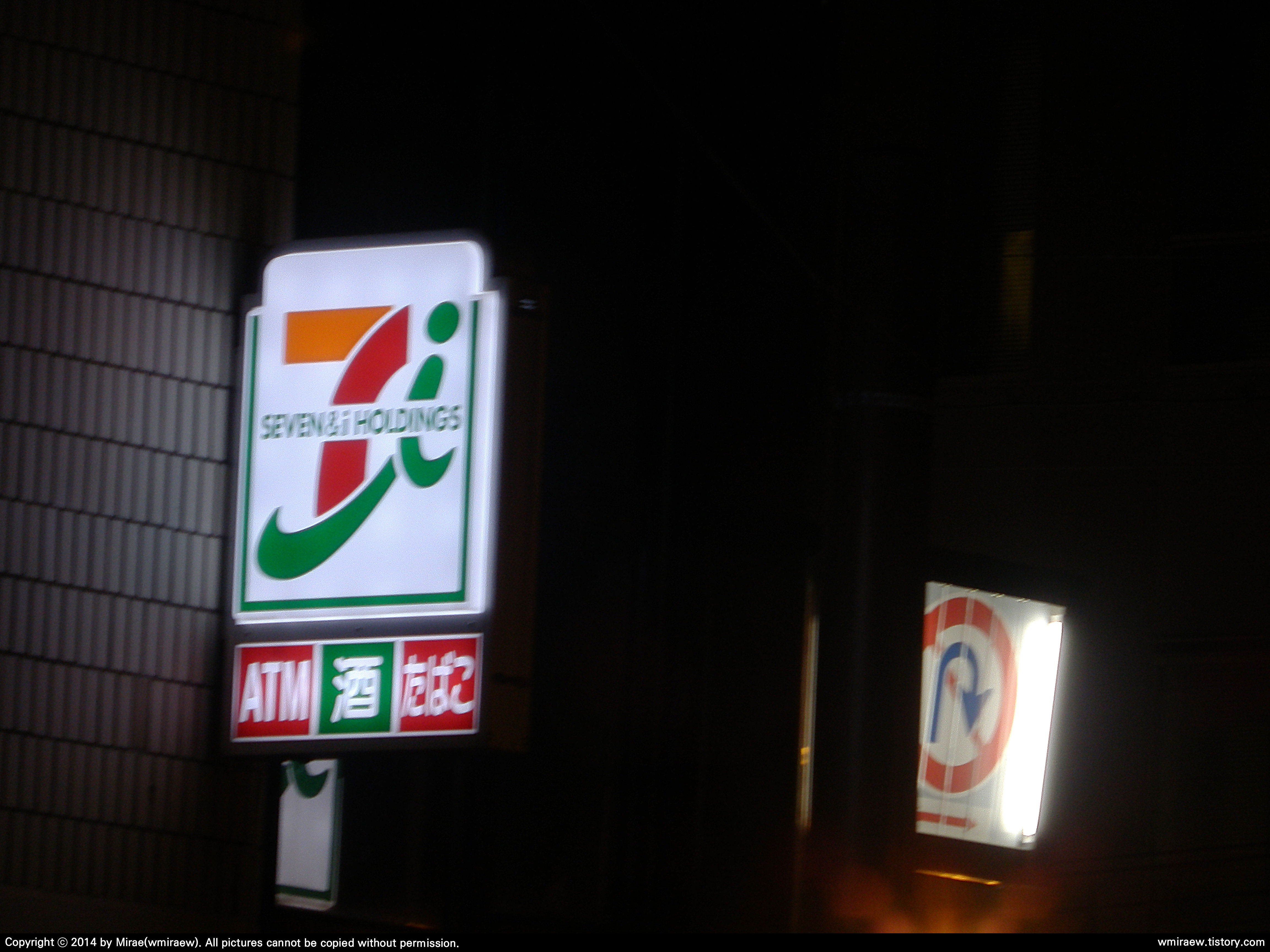 편의점 간판과 가로등, 가변식 U턴금지표지, 그리고 츠키마치역의 역명판이 빛나고 있었죠.